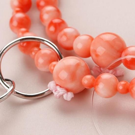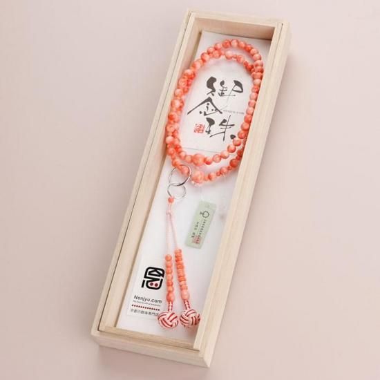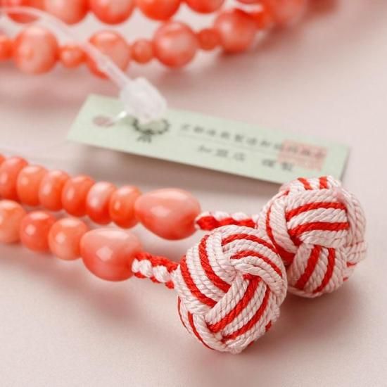 浄土宗、女性用の正式なお数珠でございます。素材は、このうえない濃淡の美しさを放つ5A´ ランク、深海珊瑚でございます。珊瑚は近年、流出量が減少傾向にあり、稀少な素材となりつつあります。そんな中、しっかりと色づいた極上の深海珊瑚でございます。また、浄土宗のお数珠には欠かす事の出来ない銀輪も店長の強いこだわりで、安価な真鍮製ではなく、本銀製を使用させて頂いております。銀輪には、本銀であることの証明のため、SILVERまたはSV925の刻印がございます。房は、丈夫で扱い易く、型崩れを起こさない小田巻梵天房を採用させて頂きました。お色目は、美心専用特別配色となっております。