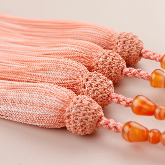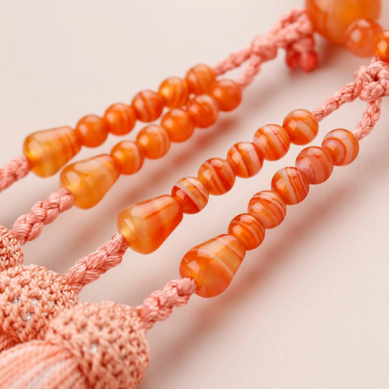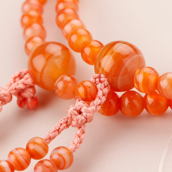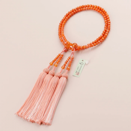 すべての宗派のお客様にお使い頂ける女性用の本式数珠でございます。お数珠が二重になっているため、体裁がよく人気のお数珠でございます。素材は、ひと玉ひと玉、異なる縞模様が大変魅力的なオレンジ縞瑪瑙でございます。素晴らしい縞模様をご覧頂ける上質の逸品でございます。玉の加工も丁寧に施されておりますので、お数珠の輪も大変綺麗でございます。房は、お数珠全体のバランスが良くなるよう、より繊細で美しく、女性らしい、正絹製頭付松風房を特注にてご準備させて頂きました。高級感溢れるお洒落な2色重ね仕様でございます。